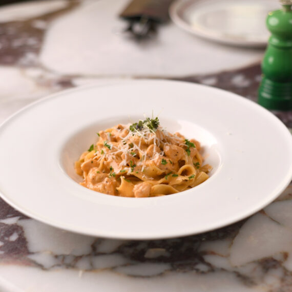 Handmade pasta prepared in our kitchen, served with salmon, tomato sauce, fresh cream, onions, garlic, lemon zest, and parsley.
